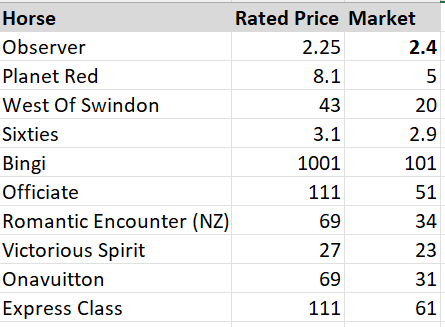 Field of ten runners in the Australian Guineas. I don’t think they will go too hard here with Observer likely to take up the running. Seems like a race in two which the market has picked out. Under set weights, Observer gets in very nicely as a 107 rater after winning the Autumn Stakes. Planet Red is the closest with a rating of 98 and would normally be getting 4.5kg off Observer. Sixties is a 3yo on the up and will appreciate the extra ground. He carried a decent weight in the CS Hayes, sat wide and finished off strongly. My main concern with him is the tempo may not suit. Planet Red seems under the odds and the rest are up sharply in grade. I’m siding with the class runner Observer.