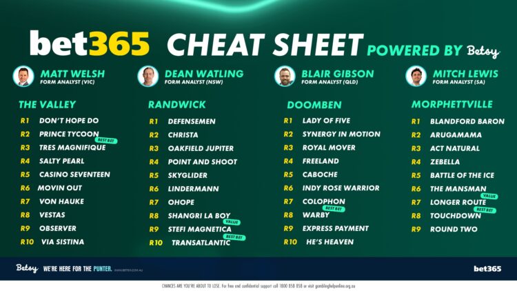 <a href="https://betsy.com.au/wp-content/uploads/2025/10/Cheat-Sheet-Cox-Plate-Day-1.png"><strong>You can download the Cheat Sheet HERE</strong></a> Group 1 racing continues across Australia today. You can find our full previews below. <a href="https://betsy.com.au/betsys-set-randwick-2/"><strong>Get Dean Watling's tips here</strong></a> <a href="https://betsy.com.au/betsys-set-cox-plate-day/"><strong>Get Matt Welsh's tips here</strong></a> <a href="https://betsy.com.au/betsys-set-doomben-3/"><strong>Get Blair Gibson's tips here</strong></a> <a href="https://betsy.com.au/betsys-set-morphettville-5/"><strong>Get Mitch Lewis' tips here</strong></a> <a href="https://betsy.com.au/good-will-hunting-cox-plate/"><strong>Get Will Elford's Preview of the Cox Plate here</strong></a>
