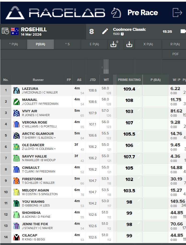The Racelab Prime Ratings for each horse can be seen in the screenshot below.