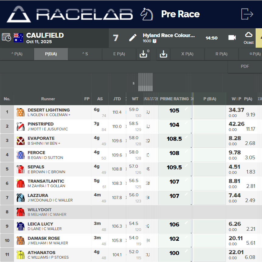 The Racelab Prime Ratings for each horse can be seen in the screenshot below: