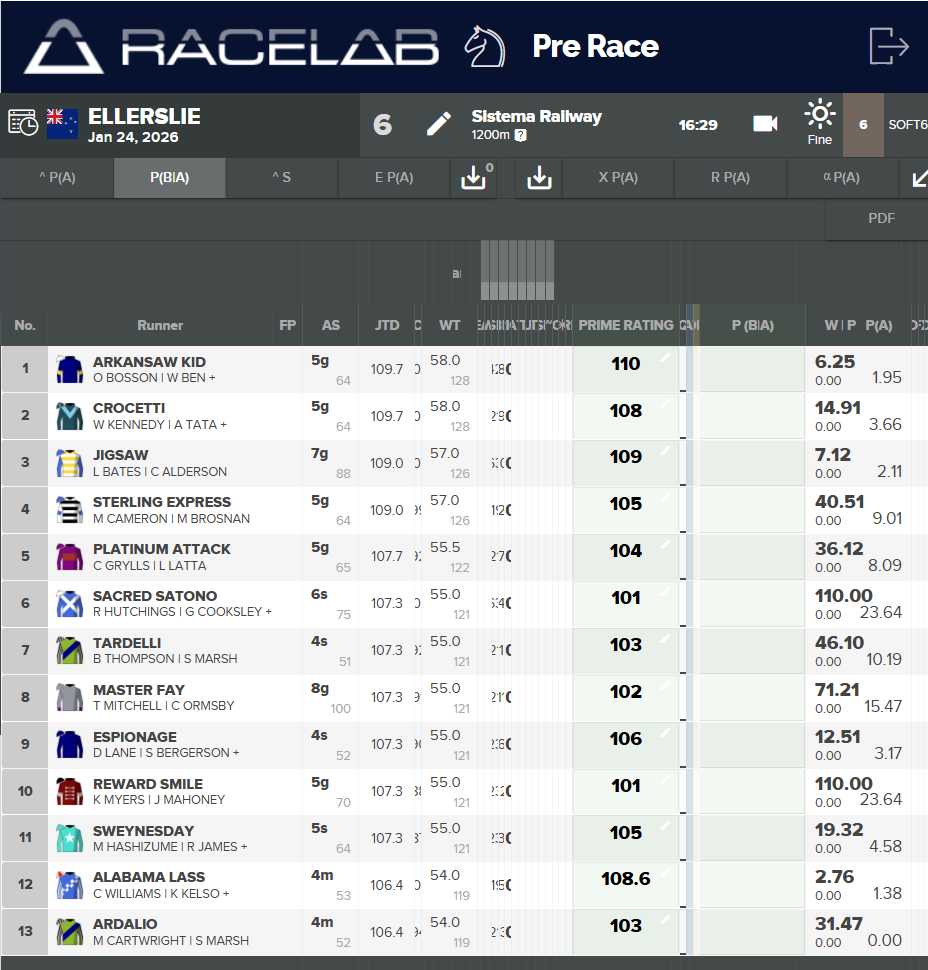 The Racelab Prime Ratings for each horse can be seen in the screenshot below.