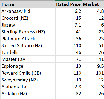 Based off a range of data, speed map and recent form, Racelab has come up with its own 100% market, which is compared to the current market in the table below. Value exists where the Racelab price is lower than the current price.