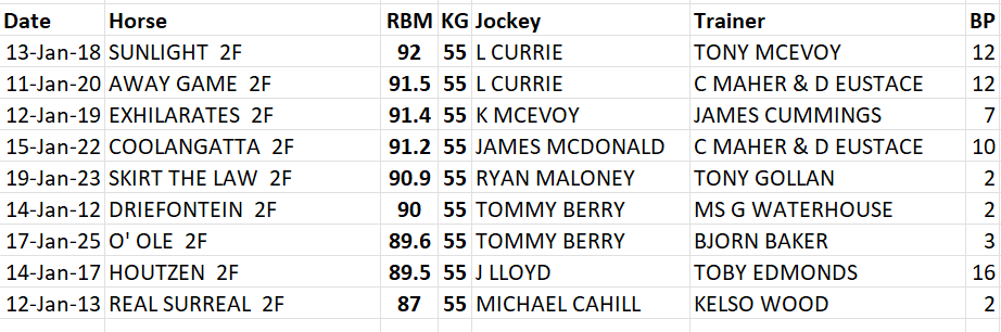 | RBM | (Rating By Margin) Racelab performance rating using a combination of metrics: Benchmark, Weight Carried, Mean Weight and Distance. |