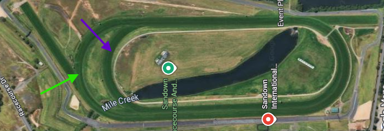 Image: Sandown. The purple arrow is the Lakeside track, Green the Hillside track. The chute top left is the 1000m start (more below).