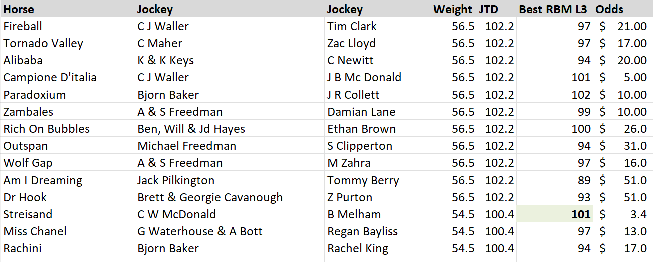 Even speed in the Inglis Sires’ so I wouldn’t be surprised to see the favourite Streisand take up the running. Paradoxium has to press forward from the wide gate and will inject some pace. The Golden Slipper is the best formline here so it’s obvious why Streisand comes out as top chance in early markets. He’s been racing in peak form and will put himself in the thick of it again! His Slipper run was brave and was entitled to feel the pinch late. Campione D’italia closed off with the second fastest 200m split of the Slipper and gets J Mac for the second time. He will appreciate the extra distance but does get a fair way back. Rich On Bubbles brings a different formline and represents big value at $26 with a lovely run throughout.