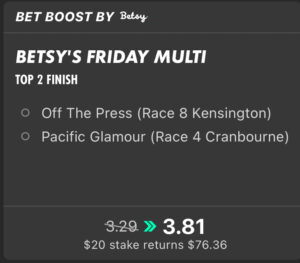 Very keen to round out the program with Off The Press, Todd Smart has this gelding in career best form. He was gritty last time out and looks better suited again here with no real pressure up on speed. Me Me will look to hold leaders’ backs here third up peaking fitness-wise, talented mare who deserves her crack at metro grade now. Starboard has been given back-to-back strong hit outs at the trials, key booking of Tim Clark and shouldn’t have fitness issues over 1250m. The well-backed Kyeema is next best.