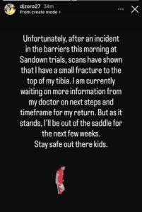 Zahra posted on his Instagram account that he won’t be riding for at least “the next few weeks”.